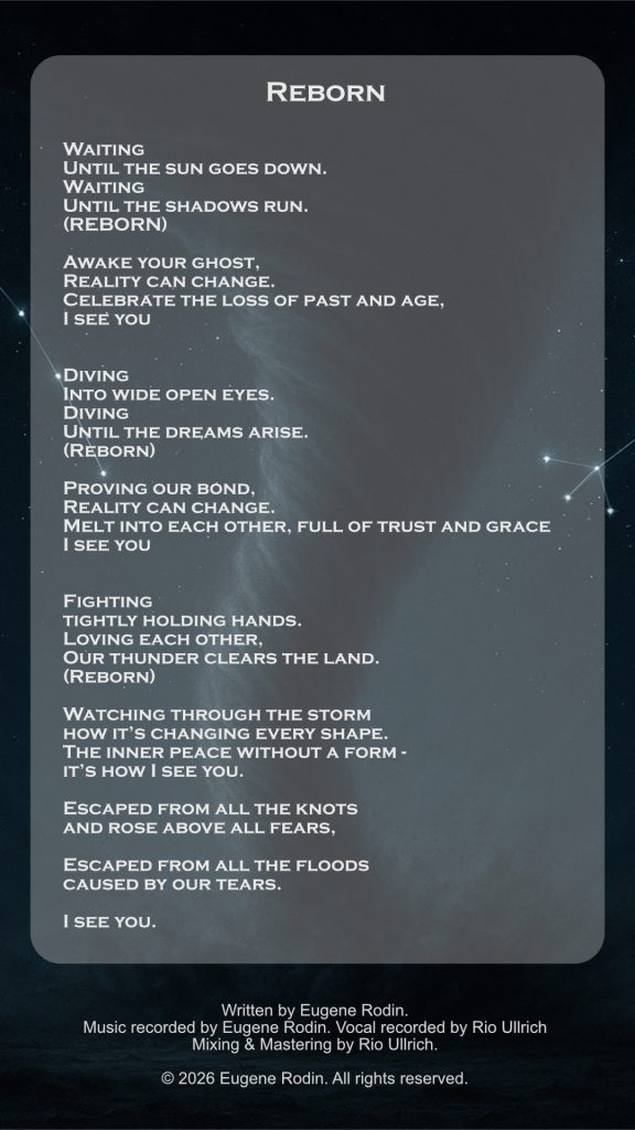 Reborn began as a simple idea almost five years ago. I recorded the main riff on my phone and saved it with other unfinished thoughts, but this one felt different—I knew immediately it would become a full song. After Human Islands was released, I started shaping ideas for the next album, and while most needed time, Reborn was already there. It’s dedicated to the person closest to me and a bond that keeps transforming, growing, and shining. This is also my first song without electric guitars.